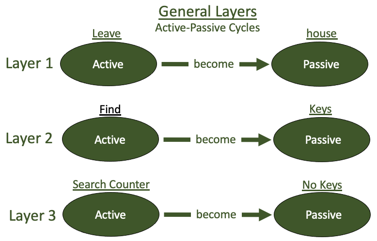 Each layer organizes the sentence’s components into specific source and target orientations, anchoring meaning dynamically. Below shows how each orientation layer parses the text and base verb. Notice in the graph that there is a target orientation (passive set) and the context of text (the focus). The source orientation (active set) anchors how the target orientation (association array potentials) aligns with the context of text.