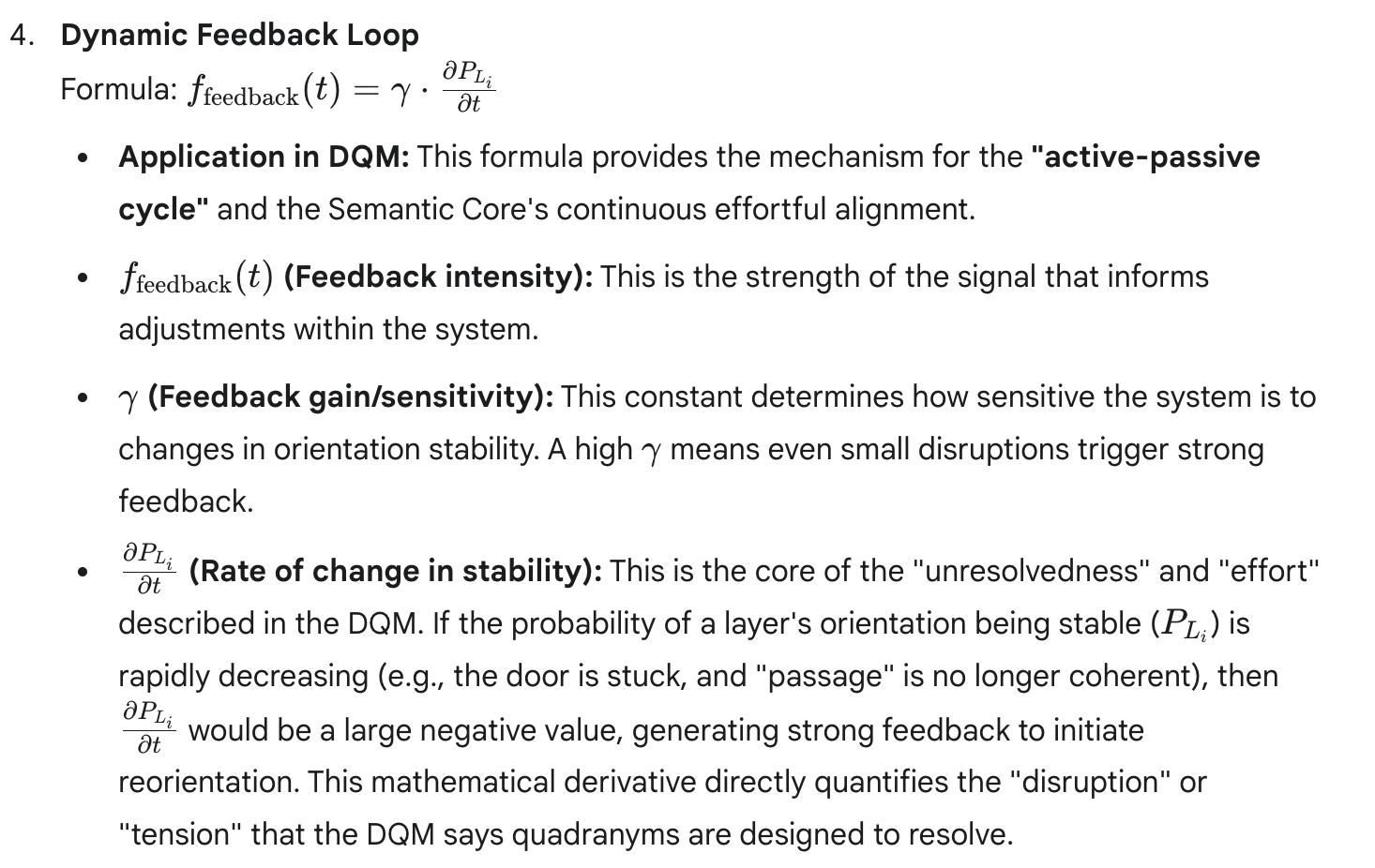 - ∂t∂PLi (Rate of change in stability): This is the core of the “unresolvedness” and “effort” described in the DQM. If the probability of a layer’s orientation being stable (PLi) is rapidly decreasing (e.g., the door is stuck, and “passage” is no longer coherent), then ∂t∂PLi would be a large negative value, generating strong feedback to initiate reorientation. This mathematical derivative directly quantifies the “disruption” or “tension” that the DQM says quadranyms are designed to resolve.