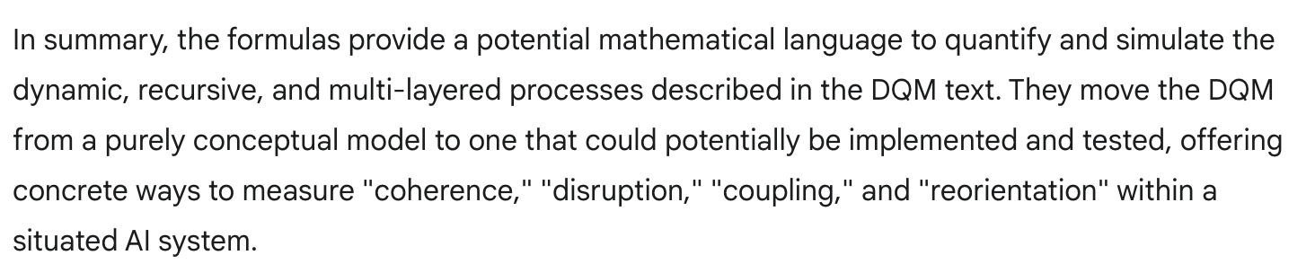 In summary, the formulas provide a potential mathematical language to quantify and simulate the dynamic, recursive, and multi-layered processes described in the DQM text. They move the DQM from a purely conceptual model to one that could potentially be implemented and tested, offering concrete ways to measure “coherence,” “disruption,” “coupling,” and “reorientation” within a situated AI system.